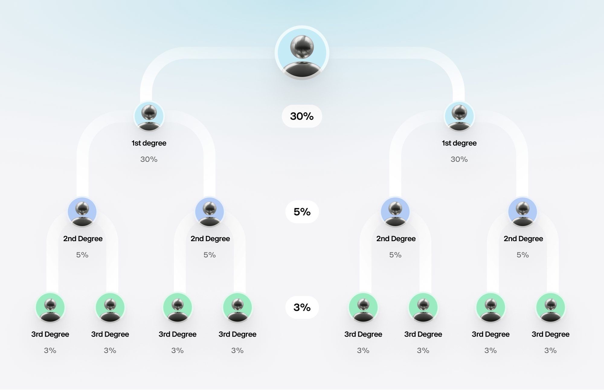 You earn rewards across three referral degrees: